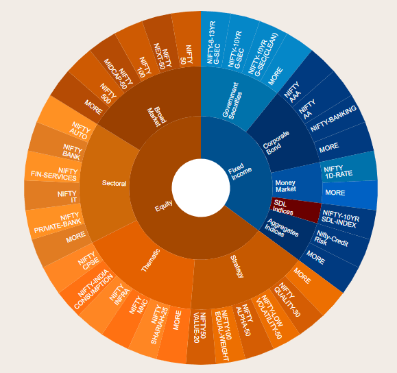 In India both BSE and NSE defined many Indices based on various criteria such as Market Cap/Size of the company, Momentum , Low Volatility etc. and their mixes. There are also Indices related to Sector, Theme, Investment Strategy, Asset Class etc. NSE has created a dedicated website to describe all their Indices and also provide the Mutual Funds and ETFs names with follow those Indices.